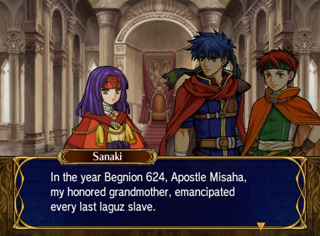 Much like Ranulf, Sanaki praises Ike's intelligence. Ike really does have his moments when he actually understands the politics involved. He just doesn't grasp his premises and political niceties.
