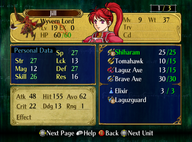 Lethe is just a prepromote with a little bit of "falling behind" syndrome, or maybe that's just the lack of pretty green numbers. Lethe can only really Transfer Strength if she's lucky, and it's a monument to how laguz work in RD that this is reason enough to go for it. Not this time, though, sadly.