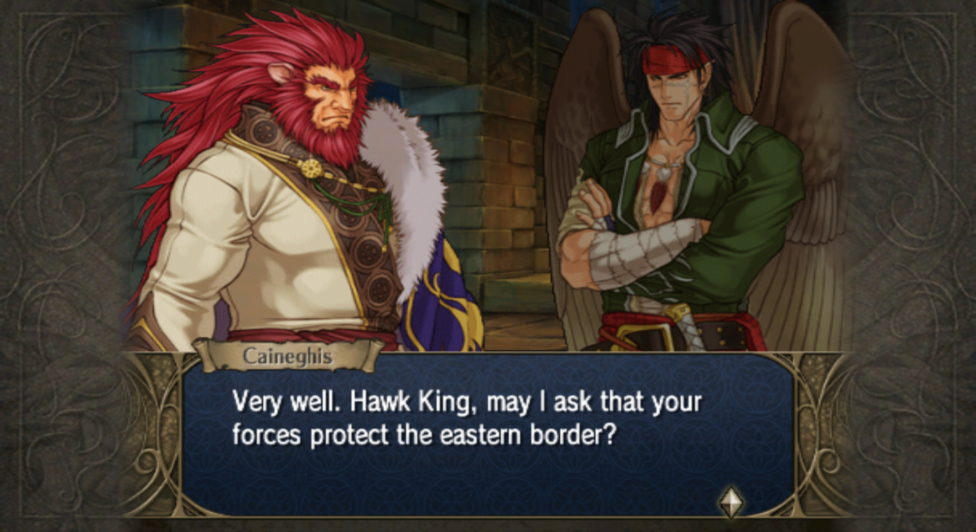 More detail on suzerainty. Skrimir notices that Gallia and the bird nations are not suzerains, and asks why. Ranulf cites the fact that the laguz nations separated while Begnion was still finding its feet. Which is... both wrong and dumb. Either suzerainty is different in Tellius to our world, or Ranulf really has no clue what he's talking about.