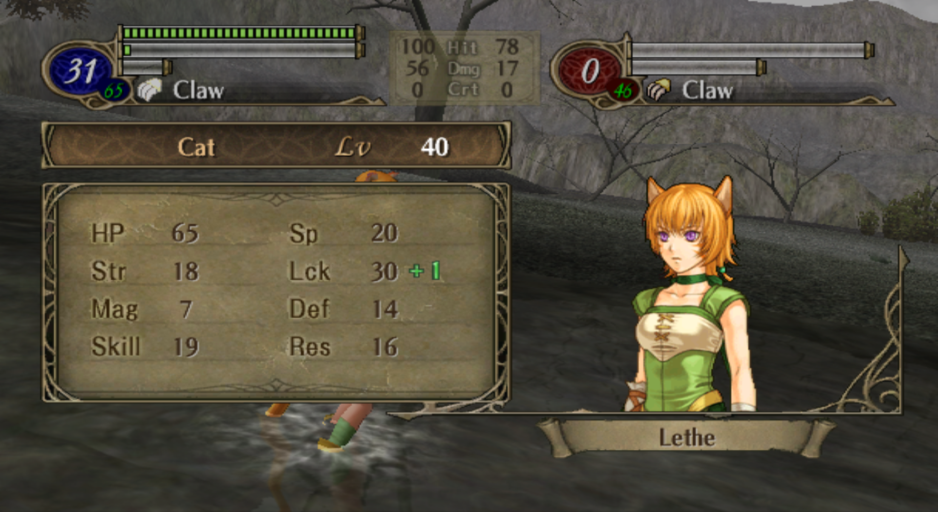 Lethe took hits from both tigers, and is now at Resolve range, allowing even her relatively poor speed to double tigers. Cats are a little more difficult, but their lower defence means Lethe should be able to manage enough Atk to oneshot them anyway.