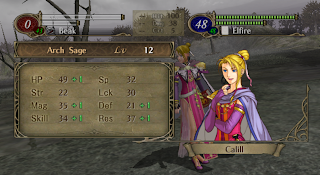 Here's our deranged lunatic, holding the SS Dark tome Balberith. That +3 Strength bonus is thanks to it. His Speed is low enough that pretty much everyone with prospects can double him, but his Resistance is huge. His Defence is pretty bleh, but his HP is enough that it might take something more than a stiff breeze to deal with him. That's a huge 53 Atk to worry about, too. And yes, he will use that Rewarp staff if he feels like it.