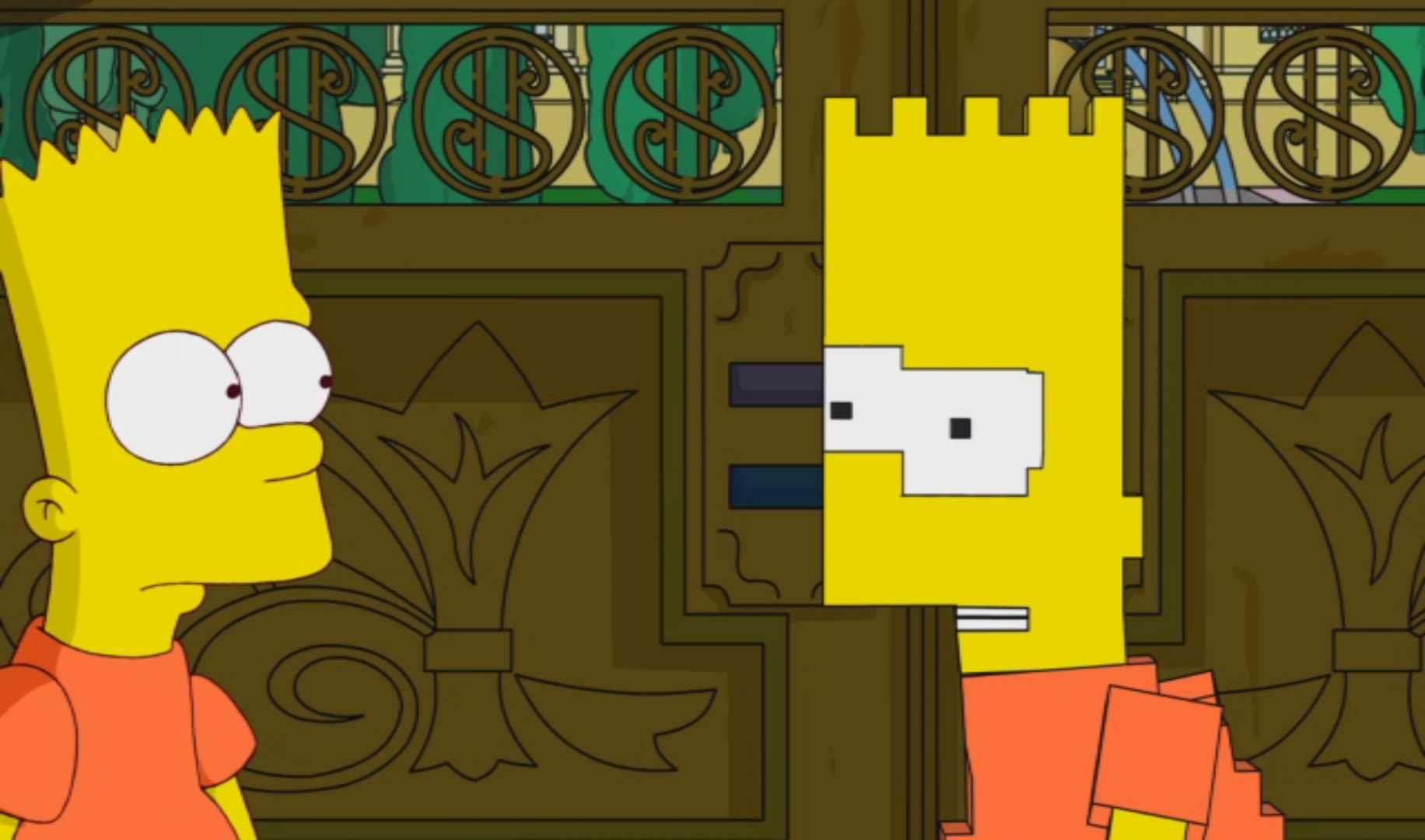Wow, the Simpsons aren't sold on the 8-bit aesthetic. I'm not sure what Marge's problem is, though, she's the only Simpson whose design uses green. I can only imagine the poor 80s programmer that was told "make it possible to distinguish Bart and Lisa".