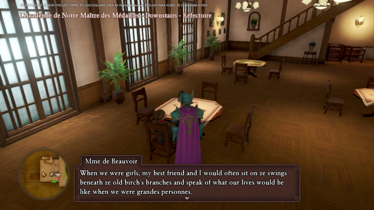 Dragon Quest has included a school setting before now- in DQ9, a school by the name of Swinedimples Academy (no prizes for guessing the reference) was the setting for retrieving the seventh Fygg. Swinedimples was a proper Town Story of its own, complete with a dungeon and a boss fight, but the comparisons between L'Academie and Swinedimples are not nonexistent- not only can you get the school uniform as an armour (it's not as good, but it's unisex), but there are wide breadth of sidequests in both- L'Academie's don't have a theme (and there are more later on), but Swinedimples has weapon instructors- demonstrate proficiency in the ten weapons, Shields and Fisticuffs, and you can get powerful weapons and weapon skill manuals. DQ9's mechanic system is a lot more dynamic, but DQ11 is more character focused.