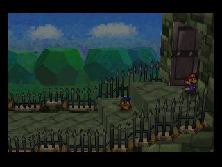Green has just finished up locking a key in a jail cell. An interesting thing about Paper Mario is that they use barred prisons often, despite the fact that paper characters should logically slip right through the bars. Notice, however, that there is a bottom bar at ankle height- the original trilogy is good at putting horizontal bars on their jails. I think the modern trilogy, since the fact everyone is made of paper is super relevant, simply doesn't bother with the barred prisons because of exactly this.