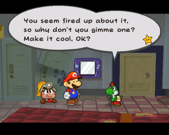 Goombella: Seriously, Mario, I wonder about you sometimes. We're taking him, and that's that. You hear that, little guy? Just make sure not to get in our way, though, OK?