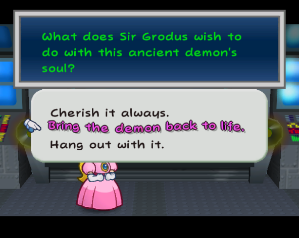 You better hope Peach remembers this one, it's the crux of the fight the two of them got into at the end of the last one. It is something that TEC wants Peach to recall, though. Again, the distractors are pretty easy to sift out- Grodus is already rich, and the image of Grodus flying around with a cape is too comical to put to paper. He certainly seems in no hurry to be altruistically saving people from peril- especially since he's already got a damsel in distress in his basement.