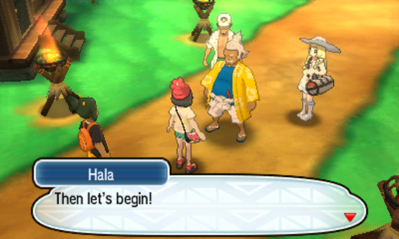 Hala scolds us for having injured Pokemon, mostly as justification for the free heal. We were told to explore while we walked here, Hala. Not my fault Iki doesn't have a Centre.