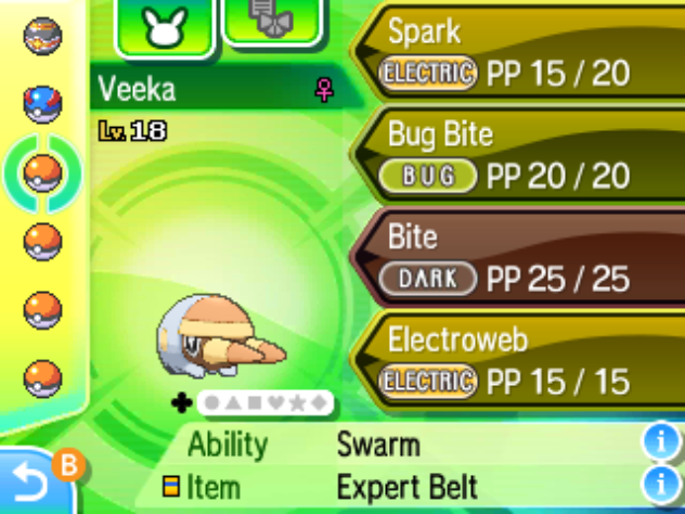 Dark types + Leech Life = not wanted. Fur Coat will give it the necessary bulk, but if you thought this was bad, you should see the rest of the team. It was this or a Rock/Ground type- although now I mention it, Dawn might've been nice for a quick cheap shot with SE Rock Throw. I think I just wanted to have Penny on hand in case I needed it for Angry Bird's strategy.