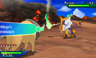 Anyway, as a boss, Totem Marowak takes Salazzle, throws its whole gimmick out the window, and decides "you know what? Fire Trial kicks your ass now." It has an IV spread of 31 flat except for Sp. Atk and Spd (in which it has 1), its EVs are set 252 HP, 106 Def and 152 Def, it has been assigned a Careful Nature (+Sp. Def, -Sp. Atk- you're not getting lucky with the Nature drops on important stuff anymore), and its moves make Totem Salazzle look like a wild Pokemon. Before I tap into them, a side note on stat numbers, for those who care: It has 79 HP (so still two-shot by Dragon Rage), its Def and Sp. Def are 65 and 60 respectively (so, mostly mixed bulk), and 25 Spd at neutral (boosted to 50 with its Totem Aura).